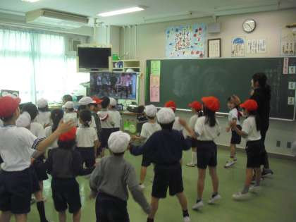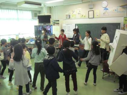 5年生はタブレット型端末で撮影した動画を使いながら、1年生を盛り上げていました。1年生も一生懸命覚えながら、一緒に楽しく踊っていました。
