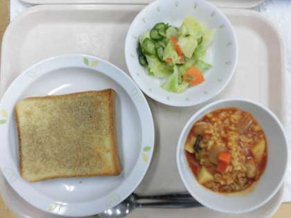 調理員さんたちが1枚1枚ていねいにぬった、セサミトーストが焼き上がりました。たっぷり入ったごまの香りで食欲が進みます。かわいいアルファベットマカロニが人気のミネストローネもできあがりました。