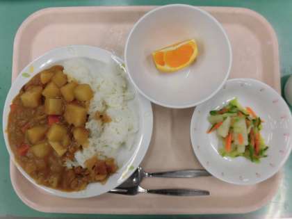 カレールーの調理が始まると校内にカレーの香りが広がり、給食の時間が待ち遠しいそうです。楽しみにしていたカレーライスを子どもたちはおいしそうに食べてました。くだものは旬のデコポンです。