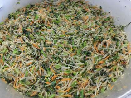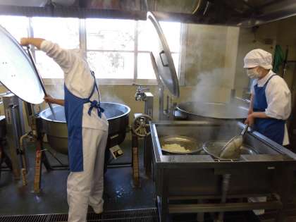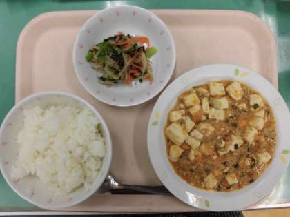 本日の献立は麻婆豆腐です。豆腐はしっかりと加熱してから中華あんに混ぜていきます。こしょうが効いた塩だれであえた塩ナムルも子どもたちが好きな味で、しっかりと野菜を食べています。