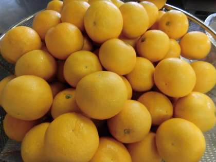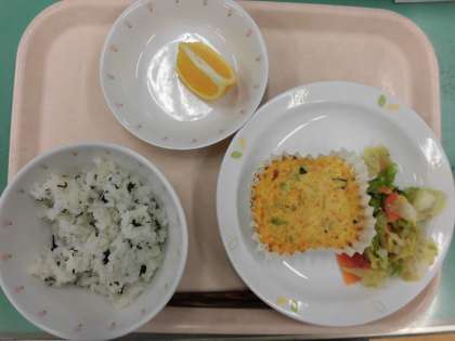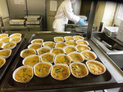 本日のくだものははっさくです。100個のはっさくをきれいに洗い、カットしていきます。野菜やぶた肉などが入った具だくさんな千草卵焼きも焼き上がりました。