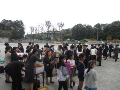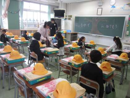 1年生100名が入学してきました。おめでとうございます。受付では、6年生が教室まで案内をします。教室では、自分の席に座って式を待ちます。そして、体育館で入学式を行いました。