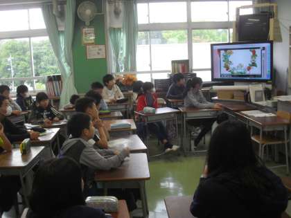 6年生は昨日から朝学習の時間に外国語を学んでいます。映像教材を視聴して、「Are you OK?」、「Wash your face.」などの日常会話を聞いたり、声に出したりして覚えています。
