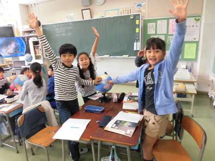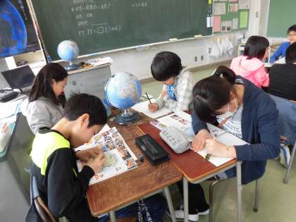 日本からスタートして、行ってみたい国にたどり着くまでにどんな大陸や海洋を通っていくのかグループの友達と確かめ合いました。世界には6つの主な大陸と3つの主な海洋があることを学びました。