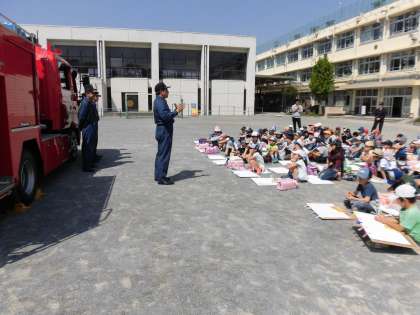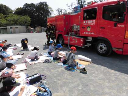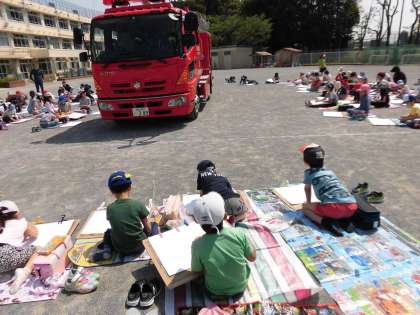 夏のような暑かったこの日、働く消防の写生会がありました。参加したのは、2年生とつくし学級の子どもたちです。校庭の真ん中に停められた赤くて大きな消防車に興味津々の子どもたち。消防署の方に避難するときに気をつけることについてのお話を聞いた後、さっそく消防車の周りにシートをしいて写生を始めました。子どもたちは、それぞれ自分が好きな場所から消防車をよく見て集中して描きました。暑さの中、みんなよくがんばりました。