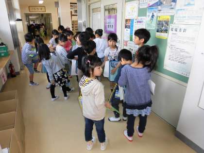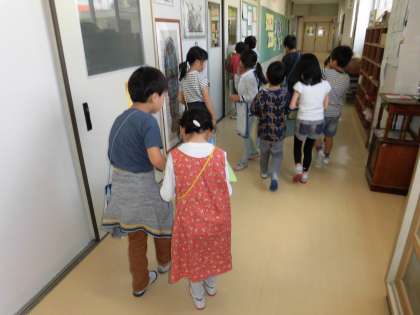 そして、探検当日。入学してきた1年生に2年生が学校の中を案内して回りました。2年生は、それぞれの部屋や場所の名前や何をするところなのか、どんなときに使うのかなど、1年生に優しく説明しました。そして、いろいろな場所を回るごとに、1年生が持っている学校の地図にシールを貼ってあげました。ペアの1年生としっかり手をつないで仲よく探検している2年生の姿は、頼もしく、立派でした。