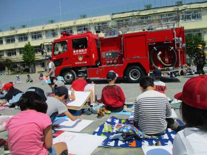 10時からは、2年生と一緒に「働く消防の写生会」を行いました。赤い大きな消防自動車や消防士さんの絵を描きました。図工の学習で練習してきた、クレパスの使い方を思い出しながら、丁寧に塗って仕上げました。