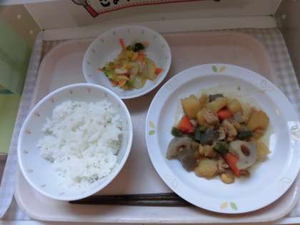 ★にんじん じゃがいも 大豆などがたくさん入った筑前煮ができました。給食室の大釜でじっくり煮て出来上がり。