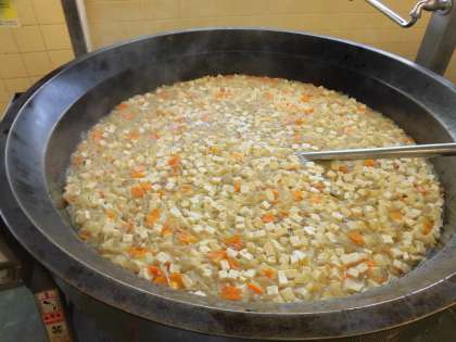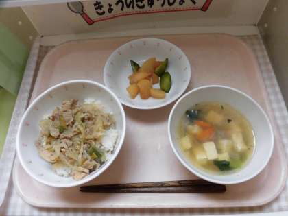 ☆今日のメニューはみんなに人気がある「ねぎ塩ぶた丼」です。かくし味のレモンがさっぱりとした味付けになっています。