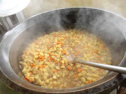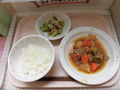 ★今日の献立は新じゃがを使用した「肉じゃがうま煮」です。給食室でたくさんのじゃがいもを切りました。じゃがいもはホクホクしていて美味しく出来上がりました。