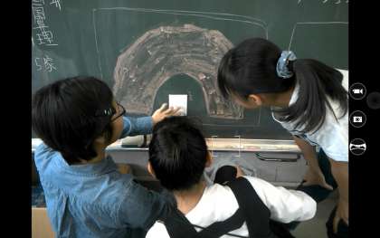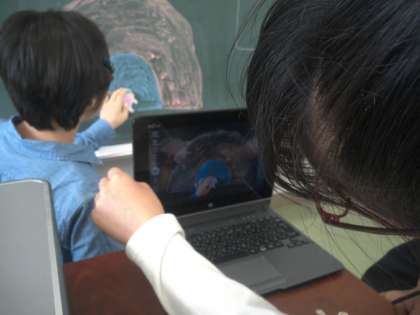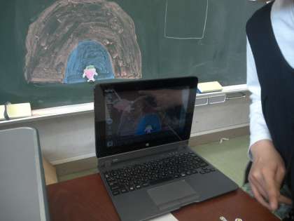 アニメーション作りに挑戦していた6年生。このグループは「天然ボケのいちご君の大冒険?」という作品をつくりました。黒板に少しづつ絵を描き足したり、消したりしながら何枚も撮影をして、プロ顔負けの作品が完成しました!!