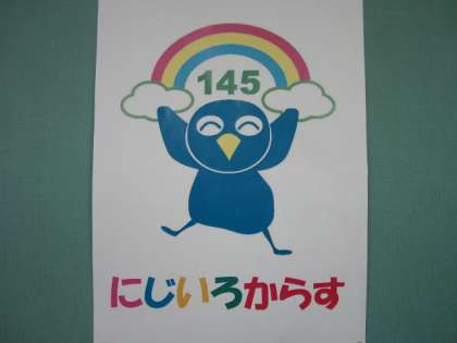 145周年の記念のキャラクターの名前は、多くの応募者の中から、「にじいろからす」に決まりました。多くの子どもたちが「にじ」「レインボー」「からす」などの言葉を使っていました。これから「にじいろからす」と覚えてください。
