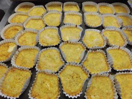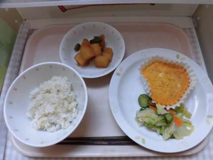 ★みじん切りにした、人参 玉葱の沢山の具と卵液を混ぜて紙カップに1つ1つ流し入れてオーブンで焼きました。栄養満点の「卵焼き」の完成です!!