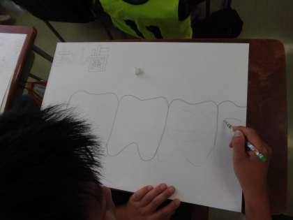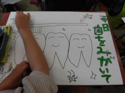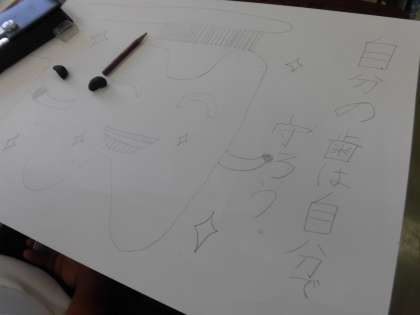 先週から取り組んでいる「むし歯予防のポスター」を画用紙に描き始めました。イラストや文字の構図を考えながら、四つ切りサイズの大きな画用紙に丁寧に描く姿が見られました。歯の大切さについて考えながら、真剣に取り組む様子が印象的でした。