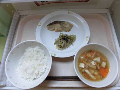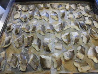 ★給食室でたくさんの魚(メルルーサ)をオーブンで焼きました。