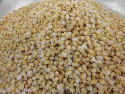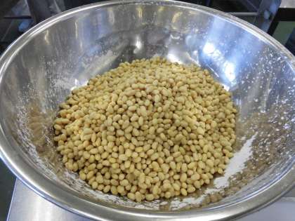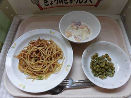 ★今日の献立で「のり塩大豆」が入っています。ゆで大豆に片栗粉をまぶし油でカラっと揚げた大豆を青のりと塩をまぶします。スナック感覚で食べられる人気献立です。