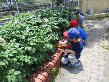 そのような中、本日の3校時は、生活単元学習の「じゃがいも博士になろう。」という学習で、学級で育てているじゃがいもの生長の様子を観察しました。草たけがのび、葉っぱの数が増え、花がさいているなど、大きくなっている様子を次々発見していました。その後、収かくの日を楽しみに追肥、土寄せをしました。