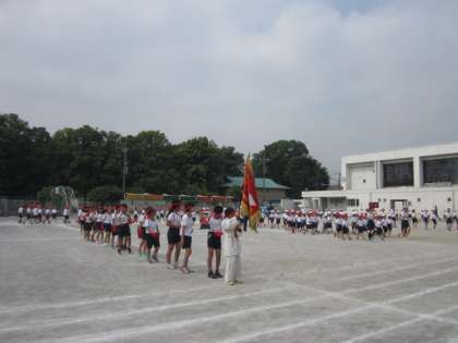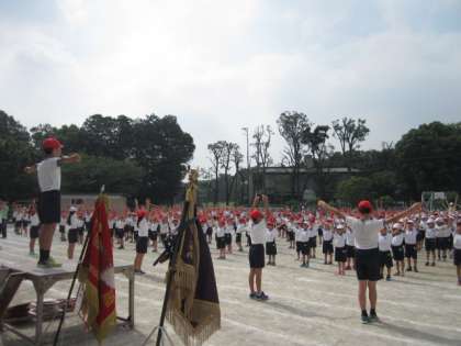 1回目の運動会の全体練習でした。この日は、入退場の練習、ラジオ体操の練習等を行いました。みんなで一緒に動いて、形を覚えました。全体練習は、後2回行います。