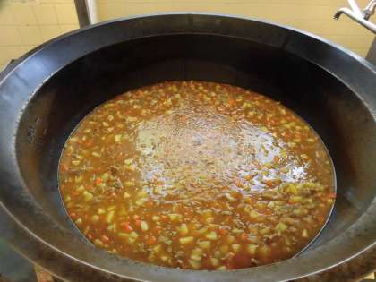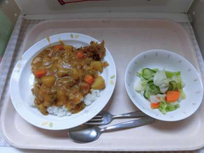☆今日は人気メニューのポークカレーライスです。カレールウだけではなくとりガラスープも給食室の釜でじっくり煮こんでいるので、とてもコクがでて美味しいカレーの完成です。