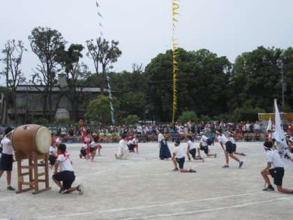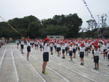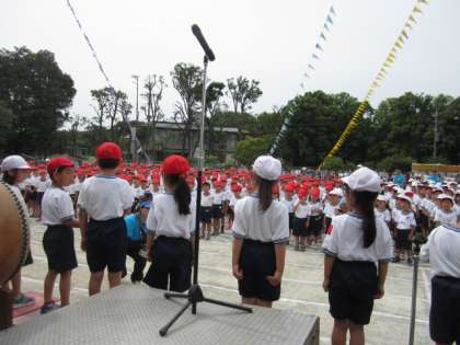 8時50分、運動会の開会式が始まりました。開会式は、児童会からスローガンの発表、「145周年、みんな楽しく全力で」がありました。1年生が児童代表の言葉を元気よく言い運動会が始まりました。その後、準備体操。そして、エール交換、応援合戦を行いました。、