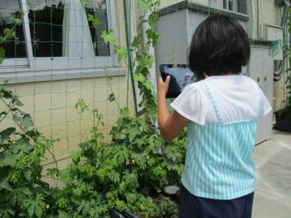 本日の低学年の生活単元学習・中、高学年の総合的な学習の時間に「季節の植物や虫を探そう」ということで、タブレット型端末を持って校庭に出て、写真を取りました。花だんの草花やてんとう虫を見つけては、「これは夏の花だね。」などと言いながら、撮影していました。次回には、自分の取った写真に書き込みをして印刷し、発見したことなどを発表し合います。
