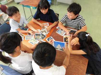 さまざまな作家の作品や建築物、工芸品などが描かれたアートカードを使って、鑑賞ゲームをしました。描かれているもの、形や色などによってグループ分けをし、お互いのチームの内容を当てるゲームを行いました。