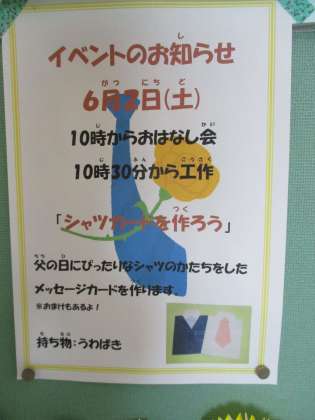 明日、6月2日 8時30分から12時に土曜日図書館開館を行います。おはなし会に続いて、イベントとして「シャツカード作り」をするので、その準備をしました。家族の人や友達に送ると喜ばれそうなカードを作ります。