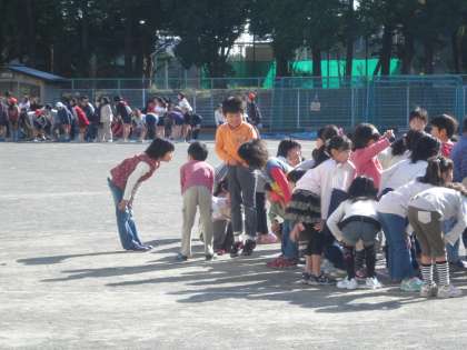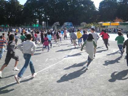 1年生は、プールの上、2年は小さいトラックを、3,4年生はトラック、5,6先生は