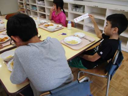 給食の時間には、順番に来てくれている4年生と一緒に給食を食べました。「どうしたら来てくれた4年生が気持ちよく給食を食べて帰ってくれるか。」学級会で相談し、みんなで考えました。折り紙を折って作品を作ったり、名札に絵を描いたりして来てくれた人にプレゼントしました。