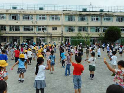 今日の集会では、運動委員会の子ども達が見本を見せてくれてみんなでリズム縄跳びを行いました。