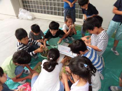 栄養士の金子先生にさやのむき方を教えていただき、さっそく作業にとりかかりました。「4つも入ってるよ。」「小さいのもあるよ。見て。」「さやの中は絵本にあるとおりふわふわなベッドみたい。」といろいろな発見をしながら、楽しんで作業しました。