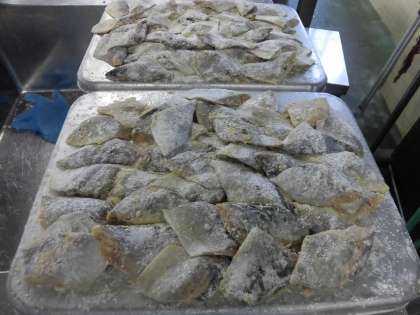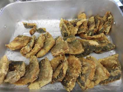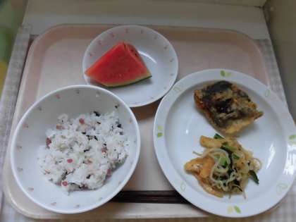 ☆今日は『鰺の竜田揚げ』です。鰺に生姜汁、醤油を混ぜたものを下味をつけて、粉をつけて大釜でカラット揚げました。鰺は旬のもので、DHAやIPAが多く含まれていて血液をサラサラにします。子どもたちもよく食べていましたよ。