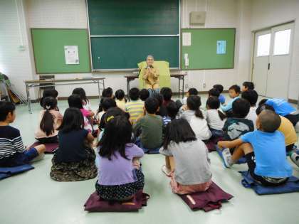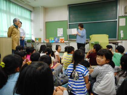 毎月1回、おはなし泉の方が、昔話の語り聞かせや、絵本の読み聞かせをしてくださいます。今日はぺープサートや手遊びもありました。