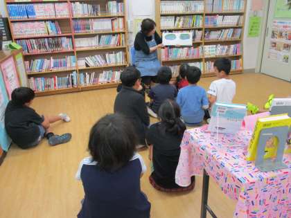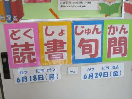 読書旬間3日目の本日は雨のため、中休みには、図書館で本を読む児童が多く、本の貸し出し数も増えていたようです。学級の図書の時間には、司書による読み聞かせが行われ、子どもたちは本の世界に引き込まれていました。