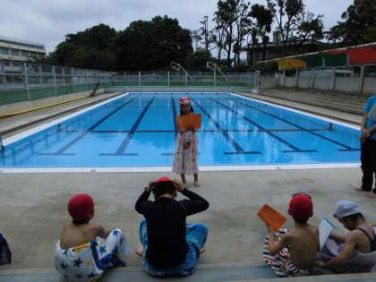 本日プール開きを行いました。気温・水温が低かったので、プールには入らないで、プールサイドで行いました。副校長先生にいらしていただき、お話をしていただきました。その後、一人ひとり水泳の学習でがんばりたいことを発表しました。最後に、楽しく、安全に水泳の学習するとことを約束しました。