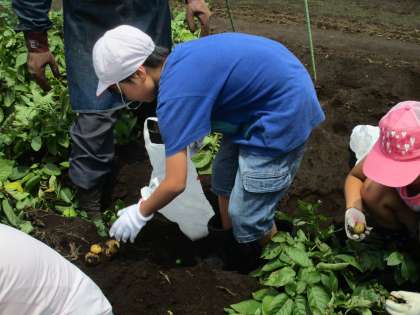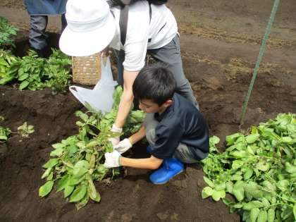 本日、つくし学級は吉岡さんの農園にじゃがいも堀りに行きました。学級でもじゃがいもを育てているので、生長の様子は見てきていました。どの子も土の中から次々でてくるじゃがいもに大喜びでした。