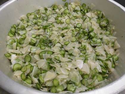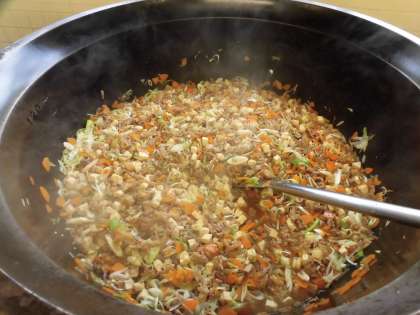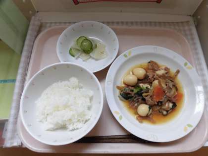 ☆今日は『すき焼き煮』です。大釜でたくさんの野菜と豚肉を煮込みました。甘がらいタレが、ごはんと とても合う1品に仕上がりました。