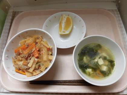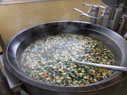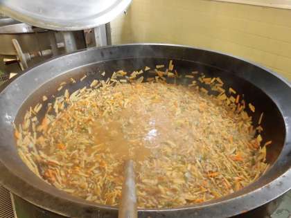 ☆今日の献立は『スタミナ丼』です。スタミナ丼には豚肉や8種類の野菜(人参・玉葱・たけのこ・ピーマン・長葱・もやし・生姜・にんにく)が入っていて栄養バランスがよい献立となっています。給食室の大釜でじっくり煮込みました。