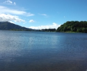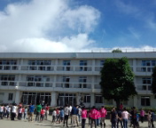 7時30分、青空の下で朝会が始まりました。皆、元気です。河口湖も朝の光を浴びて綺麗です。