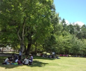 12時、昼食の時間になりました、河口湖の最後の食事です。広場でたくさん遊んだので、食がすすみます。心地よい風が吹いてきます。青空も木々の緑も、綺麗です。屋外で食べるご飯は美味しいです。各学校、木の下での食事タイムでした。