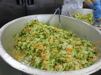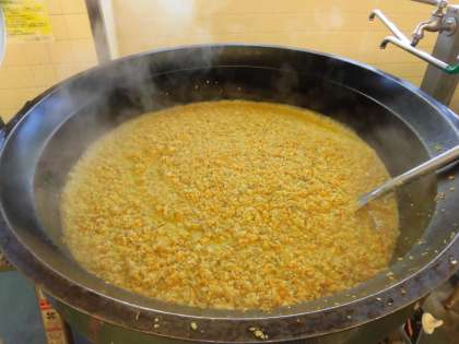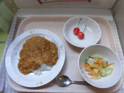 ☆今日の献立は「大豆入りキーマーカレー」です。皆さんが大好きな献立ですね。給食室では、鶏ガラからしっかりスープを作り、カレールウも小麦粉・油・カレー粉をじっくり炒めた手づくりルーです。野菜もたくさん入ったカレーは子ども達に大人気のメニューです。