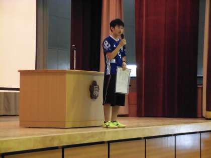 今日は全校朝会の後145周年記念集会が開かれるため、体育館で朝会を行いました。