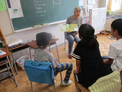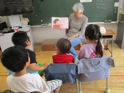 牧先生のお話会がありました。今の季節にふさわしい梅干しの作り方を表した「うめぼしさん」は、思わず「すっぱい。」と言ってしまいそうなお話でした。このほか1組では、みんなよく知っている「おおきなかぶ」は、一緒に「うんとこしょ。どっこしょ。」と大きな声で読んでいました。2組では「こすずめのぼうけん」をどきどきしながら聞いていました。「今日は、どんな本かな。」と子供たちは、牧先生のお話をいつも楽しみにしています。