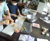 15時15分、飯ごう炊さんが始まりました。野菜係、飯ごう係、かまど係に分かれてグループごと、協力しあってすすめています。美味しいカレーライスができるでしょうか。がんばっています。