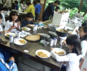 16時45分、できたグループからいただきます。みんなで協力して作ったカレーは美味しいです。子どもたちは、最高と言って食べていました。
