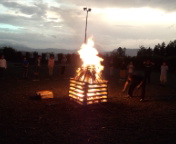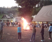 19時、雨が少し降ってきました。しばらくしたら止むという判断のもと、キャンプファイアを始めました。大きな火の周りで、ゲームをしたり踊ったりして楽しみました。盛り上がりました。雨も止んで思い出残るキャンプファイアができました。
