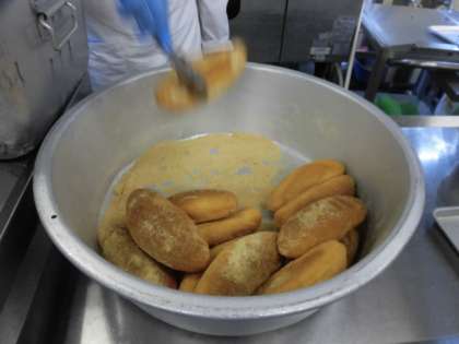 ☆今日はみんなの大好きな『きなこあげパン』です。大釜でコッペパンを掦げて、きなこ・砂糖・塩を合わせたものを からませ完成です。