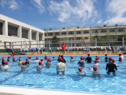 7/9火曜日の1・2校時、6年生は着衣泳の学習をしました。天気もよく、水泳指導にはぴったりの日でした。
