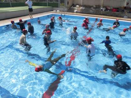 水難に遭った時は、「呼吸確保」と「体力温存」の2つが命を守ることにつながることを学習しました。実際に水中で仰向けになる練習をしたり、服の中に空気を入れて体が浮きやすいようにする方法を学んだりしました。また、ペットボトルを使うと体力をできるだけ使わないで浮いていられることも一人ひとり体験しました。