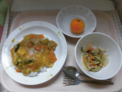☆今日の献立は『夏野菜カレーライス』です。みなさんの大好きなカレーに夏野菜がたくさん入っています。栄養満点ですね。そして、暑い時季にピッタリの冷凍みかんも大人気でした